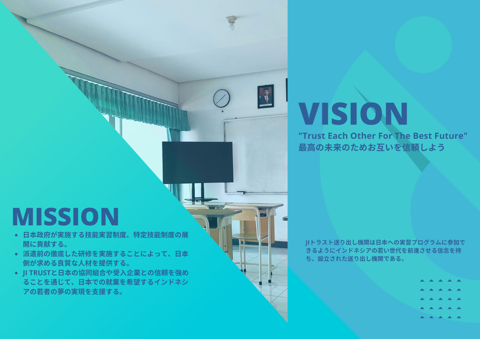 なぜなら、コミュニケーションが通じれば、教えた通り仕事ができる。これらは間違いを減らして、会社の損失も避けられる。そのため、面接の前、3ヶ月の日本語教育を行い、面接が合格の後も3ヶ月を行う。この6ヶ月で、候補者に教えたことはN5のレベルと同じである。特に介護の実習プログラムでは、当時の保健高等学校からの候補者を募集し、N3相当までの日本語教育訓練を実施している。実習生が日本へ出発する前、JIトラスト送り出し機関の訓練実施高水準は次の通りである。