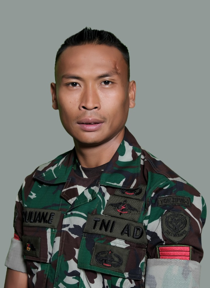 インドネシア国軍のZeni Tempur 3/YW大隊の勤務中軍人で下位入隊の陸士長である。大隊の新若者軍人の指導者である。Kodam 3 Siliwangiと西バンドゥン県KONIの運動選手である。